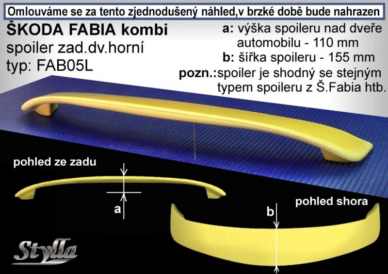 Cena za 1kus. Spoilery značky Stylla, patří svou kvalitou k nejlepším na našem, tak i zahraničním trhu. Výrobky českého výrobce jsou vyrobeny z kompozitu (odlehčený plast) dokonale pasují a jsou krásně vyhlazeny, což zaručuje, žádné dodatečné tmelení, či velké broušení, co také oceníte při přípravě na lakování. Spoilery značky Stylla budou zkrášlovat Váš automobil po celou dobu jeho životnosti. Pokud je to technicky možné, jsou téměř všechny spoilery opatřeny k uchycení vnitřními závity M5 nebo M6 a je tedy možno je jak montovat, tak samozřejmě také lepit. Rozhodnutí je tedy na Vás, zda montáž zvolíte nalepením, montováním, nebo kombinovanou. U větších spoilerů typu WRC, ST a spoilerů s malou dosedací plochou, doporučujeme uchycení kombinované. Drtivá většina spoilerů Stylla vlastní homologaci, ATEST 8SD. Výrobky mají po celou dobu životnosti stálý tvar, neprohýbají se a jsou o několik tříd kvalitou vpředu, než výrobky z domácích dílen, či burz. Jsme jedni z výhradních prodejců této značky a proto zaručujeme jednu z nejnižších cen na trhu. Návod k montáži: http://www.stylla.cz/media/navod-k-montazi.pdf