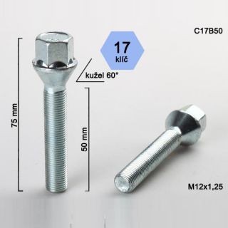 Kolový šroub M12x1,25x50, dosedací plocha kužel 60°, celková výška 75 mm, pevnostní šroub určený k uchycení ALU disků k automobilu.