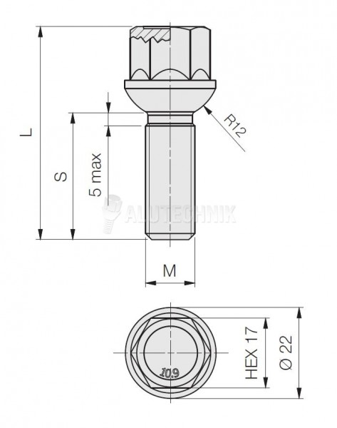 Kolový šroub M12x1,5x26, dosedací plocha koule R12, celková výška 45,5 mm, pevnostní šroub určený k uchycení plechových nebo ALU disků k automobilu.