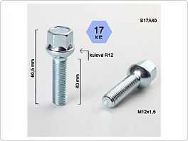 Kolový šroub M12x1,5x40, dosedací plocha koule R12, celková výška 60,5 mm, pevnostní šroub určený k uchycení plechových nebo ALU disků k automobilu.