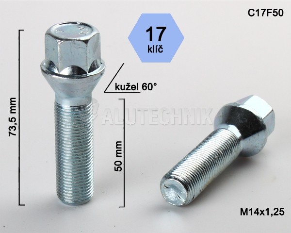Kolový šroub M14x1,25x50, dosedací plocha kužel 60°, celková výška 73,5mm, pevnostní šroub určený k uchycení ALU i plechových disků k automobilu. Délka závitu 50mm, hlava klíč 17mm. Určeno pro rozčiřovací podložky o šířce cca 20-25mm.