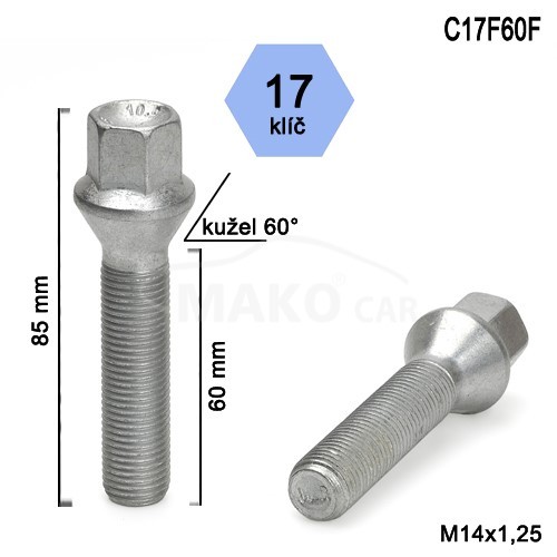 Kolový šroub M14x1,25x60, dosedací plocha kužel 60°, celková výška 85mm, pevnostní šroub určený k uchycení ALU i plechových disků k automobilu. Délka závitu 60mm, hlava klíč 17mm. Určeno pro rozčiřovací podložky o šířce cca 30mm.