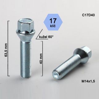 Kolový šroub M14x1,5x40, dosedací plocha kužel 60°, celková výška 63,5 mm, pevnostní šroub určený k uchycení ALU disků k automobilu.