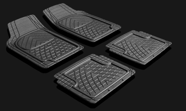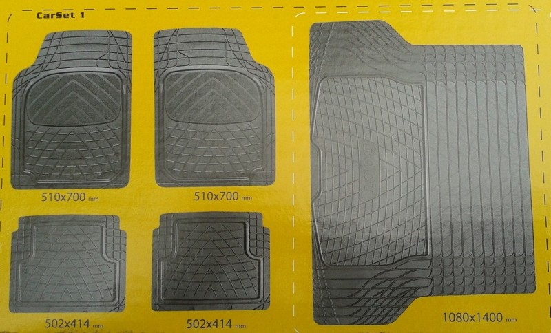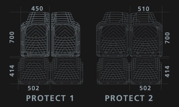 1. 4ks předních + zadních gumových koberců Protec, který mají zesílenou část pro podrážky bot a mají 1cm okraj pro udržení nečistot v koberci. Koberce mají univerzální rozměr uveden na obrázku a lze je podle vyobrazených rýh stříhat a tvarovat na váš požadovaný tvar podlahy.