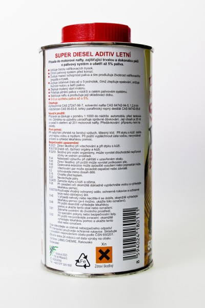 Letní přísada do nafty SUPER DIESEL ADITIV zvyšuje cetanové číslo, a tím zlepšuje spalování. Aditivum snižuje hlučnost motoru a zkracuje studený start. Multifunkční přísada do motorové nafty s protikorozními účinky udržuje čistotu vstřikovacích trysek včetně otvorů, a zabraňuje zanášení citlivých součástí motoru karbonovými nečistotami. Letní aditivum do nafty chrání palivové čerpadlo před opotřebením potlačením pěnivosti paliva v celém palivovém systému. SUPER DIESEL ADITIV ochrání váš motor před negativními účinky biosložky, která je povinnou složkou každého paliva.